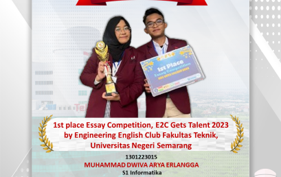 MUHAMMAD DWIVA ARYA ERLANGGA, S1 Informatika, 1301223015 Berhasil meraih 1st place Essay Competition, E2C Gets Talent 2023 by Engineering English Club Fakultas Teknik, Universitas Negeri Semarang.
