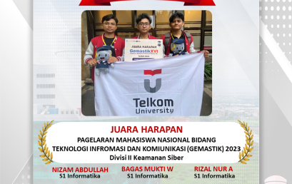 – Nizam Abdullah (S1 Informatika) – Bagas Mukti Wibowo (S1 Informatika) – Rizal Nur Arbaatun (S1 Informatika) – Dosen Pembimbing : Dr. Vera Suryani Berhasil meraih JUARA HARAPAN (Divisi Keamanan Siber) dalam Pagelaran Mahasiswa Nasional Bidang Teknologi Informasi dan Komunikasi (GEMASTIK) 2023