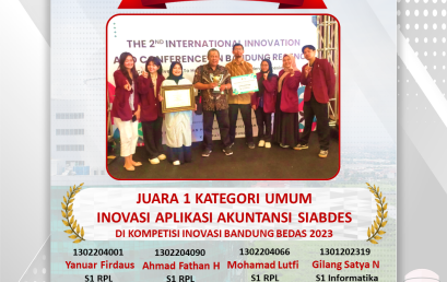 – Yanuar Firdaus, S1 RPL, 1302204001 – Ahmad Fathan Hanif, S1 RPL FIF, 1302204090 – Mohamad Lutfi, S1 RPL, 1302204066 – Gilang Satya Nugraha, S1 IF, 1301202319 – Dosen Pembimbing : Dr. Arfive Gandhi, S.T., M.T.I. Berhasil meraih JUARA 1 Kategori Umum Inovasi Aplikasi Akuntansi SIABDES di Kompetisi Inovasi Bandung Bedas 2023.