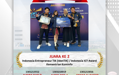 1. Alfara nafi dinara 1301213552 – S1 Informatika 2. Alifya Difa Afasyah 1303210019- S1 Teknologi Informasi 3. Fawaz Al Rasyid 1301213016 -S1 Informatika Berhasil meraih Juara 2 dalam ajang IdenTIK (Indonesia Entrepeneur TIK, dulu di kenal sebagai Indonesia ICT Award) yang diadakan oleh Kementerian Komunikasi dan Informatika (KOMINFO).